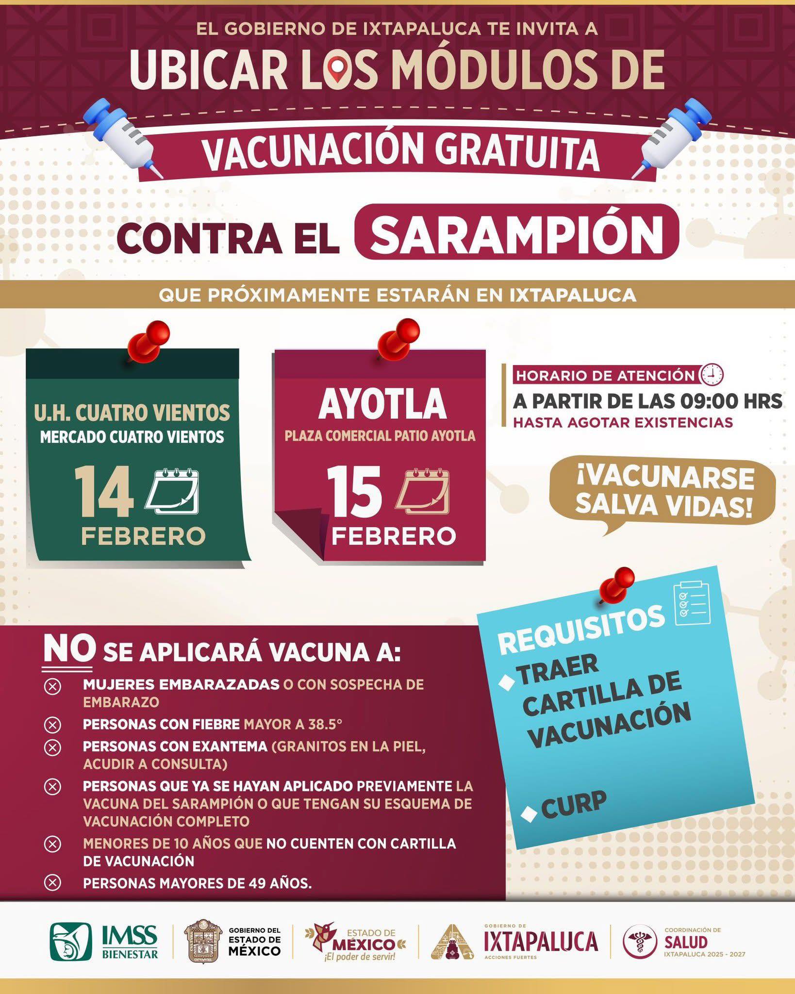 El Gobierno de Ixtapaluca invita a madres, padres y cuidadores a llevar a sus hijas e hijos a los módulos de vacunación gratuita contra el sarampión, una acción fundamental para mantener a nuestras familias sanas y seguras.