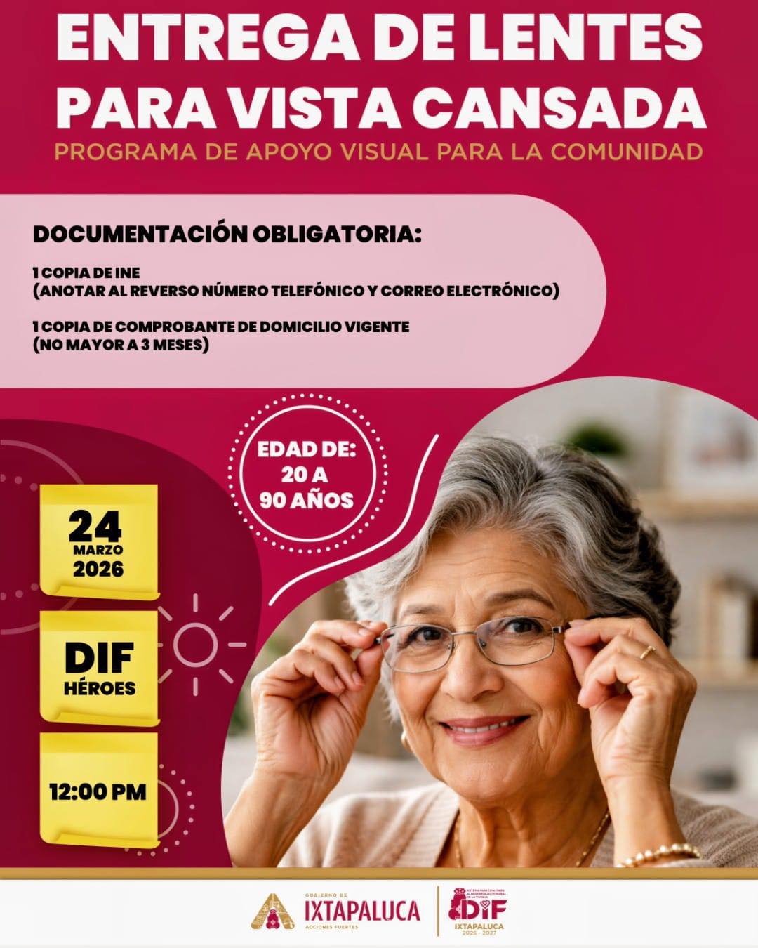 En el DIF Ixtapaluca seguimos trabajando para mejorar tu calidad de vida. Por eso, te invitamos a nuestra entrega de lentes para vista cansada, dirigida a personas de 20 a 90 años.